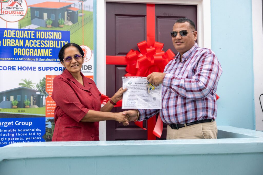 Ms. Gobin was among 18 families from the East Bank and West Bank of Demerara who received homes through the programme, which is being implemented through a partnership between the Government of Guyana and the Inter-American Development Bank (IDB), earlier today.
